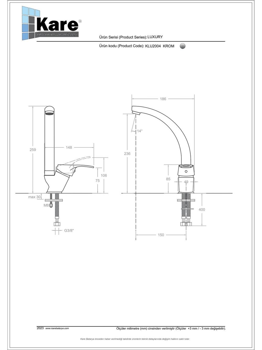 - Ürününüzün uzun ömürlü ve garanti kapsamında olabilmesi için filtreli ara musluk kullanılması tavsiye edilir.
